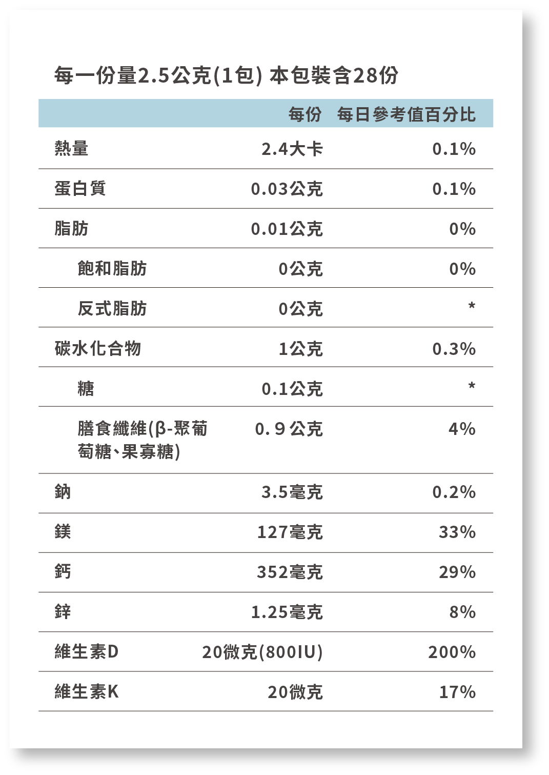 *參考值未訂定 每日參考值:熱量2000大卡、蛋白質60公克、脂肪60公克、飽和脂肪18公克、碳水化合物300公克、膳食纖維25公克、鈉2000毫克、鎂390毫克、鈣1200毫克、鋅15毫克、維生素D 10微克(400IU)、維生素K 120微克。