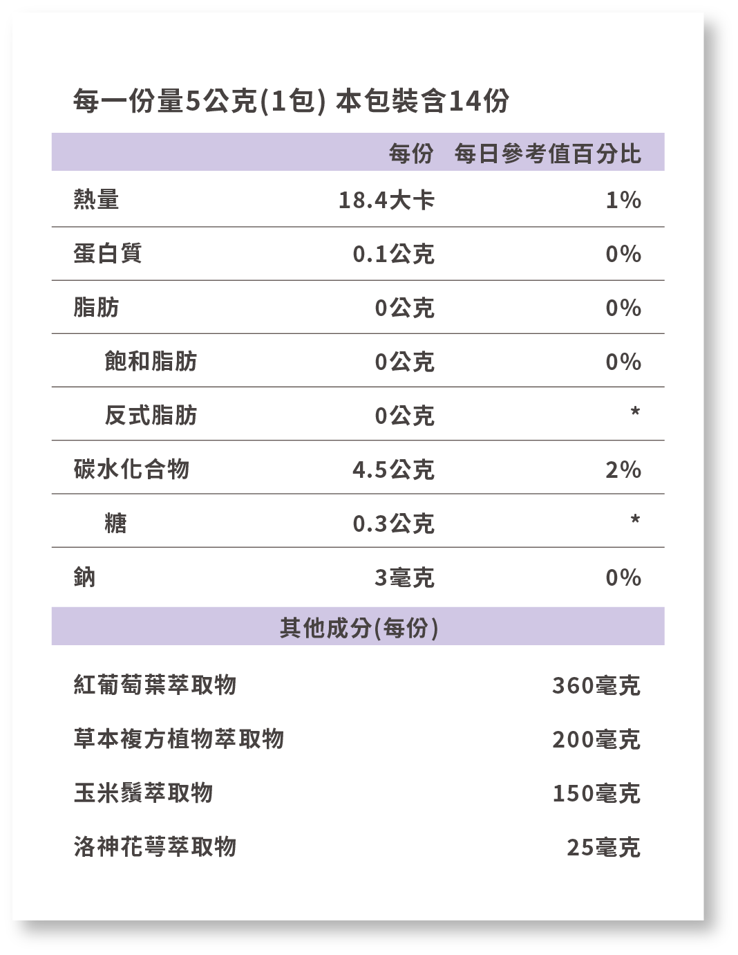 *參考值未訂定 每日參考值:熱量2000大卡、蛋白質60公克、脂肪60公克、 飽和脂肪18公克、碳水化合物300公克、鈉2000毫克。