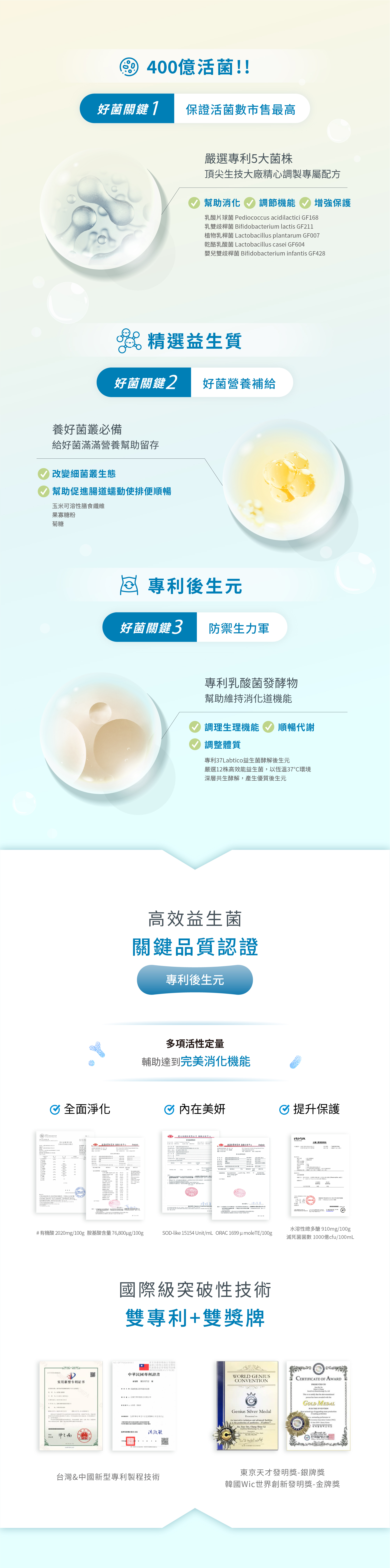 複方乳酸菌果蔬發酵是一款榮獲國際創新發明獎的完美乳酸菌與果蔬發酵物獨家複方,以高科技設備培養37Labtico後生元,加入66種果蔬酵素精華,孕育出多功能的獨家酵解酵素。含有天然SOD-like物質,具有淨化、美妍、順暢等作用。常見乳酸菌僅具有改變菌叢的效果,和此複方成分差異甚遠。