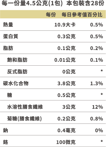*參考值未訂定 每日參考值:熱量2000大卡、蛋白質60公克、脂肪60公克、飽和脂肪18公克、碳水化合物300公克、膳食纖維25公克、鈉2000毫克。