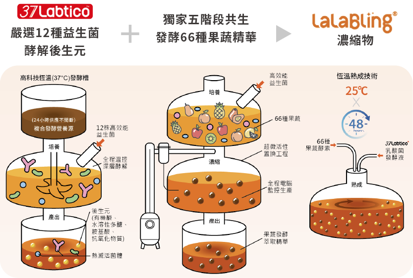 複方乳酸菌果蔬發酵是一款榮獲國際創新發明獎的完美乳酸菌與果蔬發酵物獨家複方,以高科技設備培養37Labtico後生元,加入66種果蔬酵素精華,孕育出多功能的獨家酵解酵素。含有天然SOD-like物質,具有淨化、美妍、順暢等作用。常見乳酸菌僅具有改變菌叢的效果,和此複方成分差異甚遠。